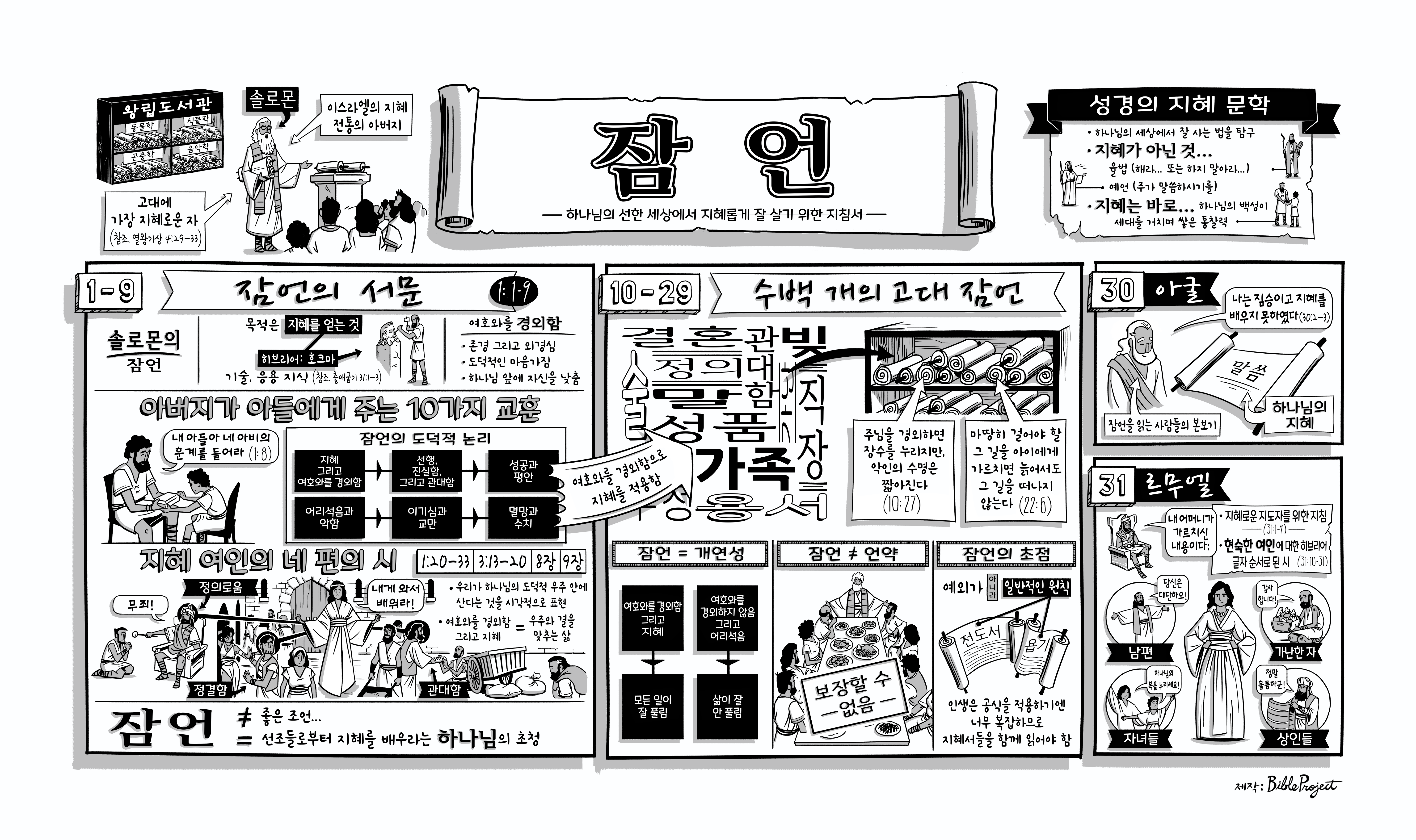 1장은 솔로몬의 지혜 전통과 여호와를 경외하는 삶의 중요성을 밝히며 시작합니다. 이어지는 10가지 교훈은 아버지가 아들에게 주는 훈계로, 지혜를 따를 때 성공과 평안을 얻는다고 가르칩니다. 또한 ‘지혜의 여인’의 시가 등장하여, 하나님께서 창조하신 우주 질서와 조화를 이루며 사는 삶을 권면합니다.