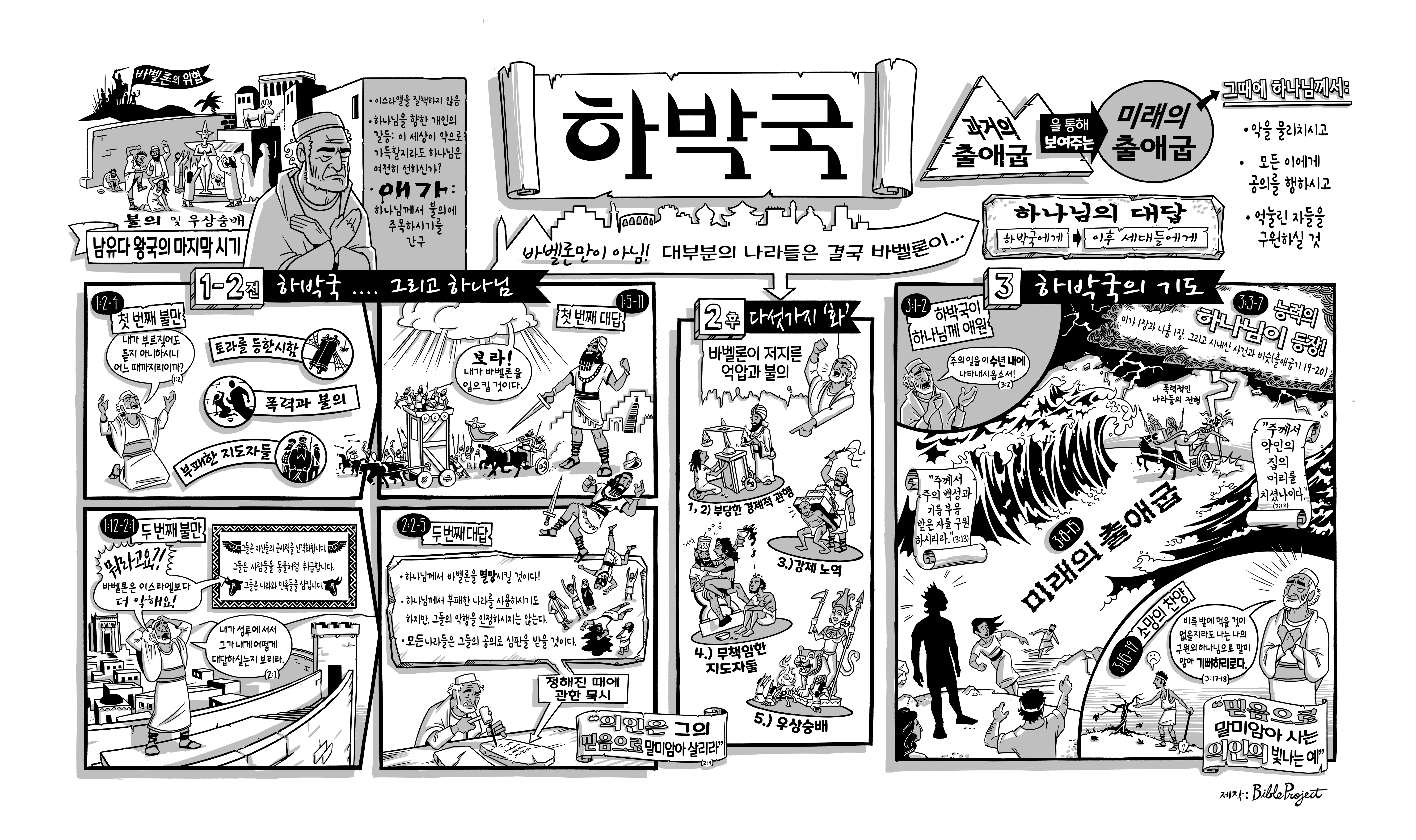 하박국은 먼저 이스라엘 안의 폭력과 불의를 고발하며 하나님께 개입을 요청합니다(1:2-4). 하나님은 바벨론을 일으켜 심판하시겠다고 응답하시죠(1:5-11). 그러나 하박국은 바벨론이 더 악한데 어떻게 그런 나라를 사용하시냐고 항변합니다(1:12–2:1). 이에 하나님은 “때가 정한 묵시는 반드시 성취된다. 의인은 믿음으로 살리라”(2:2-5) 하시며, 바벨론 또한 결국 멸망할 것을 약속하십니다.